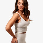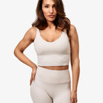 The Alba top combines bra and tank in one seamless design. Featuring a deep V-neck, U-shaped back, light support, and fixed pads.